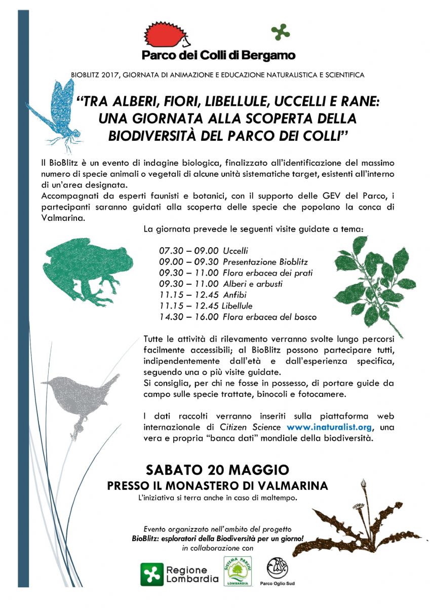 Avete mai partecipato ad un bio…blitz? L’occasione è sabato 20 maggio, quando il Parco dei Colli di Bergamo aderirà a “BioBlitz: Esploratori della Biodiversità per un giorno!” evento di educazione naturalistica e scientifica nelle aree protette lombarde promosso da Regione Lombardia e AREA Parchi, in collaborazione con Parco Oglio Sud, la Riserva Le Bine e altre 28 aree protette
