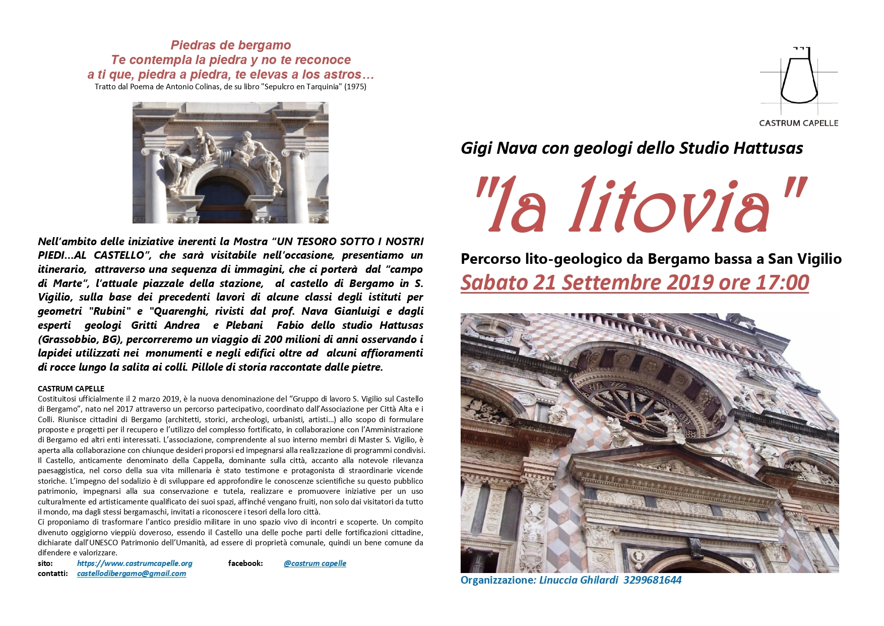 Nell’ambito delle iniziative inerenti la Mostra “UN TESORO SOTTO I NOSTRI PIEDI…AL CASTELLO”, che sarà visitabile nell’occasione, presentiamo un itinerario, attraverso una sequenza di immagini, che ci porterà dal “campo di Marte”, l’attuale piazzale della stazione, al castello di Bergamo in S. Vigilio, sulla base dei precedenti lavori di alcune classi degli istituti per geometri "Rubini" e "Quarenghi, rivisti dal prof. Nava Gianluigi e dagli esperti geologi Gritti Andrea e Plebani Fabio dello studio Hattusas (Grassobbio, BG), percorreremo un viaggio di 200 milioni di anni osservando i lapidei utilizzati nei monumenti e negli edifici oltre ad alcuni affioramenti di rocce lungo la salita ai colli. Pillole di storia raccontate dallepietre.