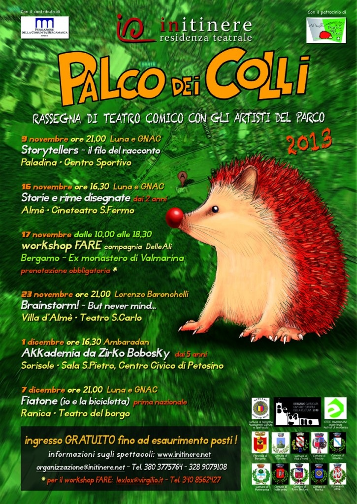 Tutti gli spettacoli sono offerti ai Comuni del Parco dei Colli a titolo gratuito. È un modo di raccontare come abbiamo impiegato il tempo, e insieme una forma di restituzione al territorio del Parco del risultato del nostro lavoro.