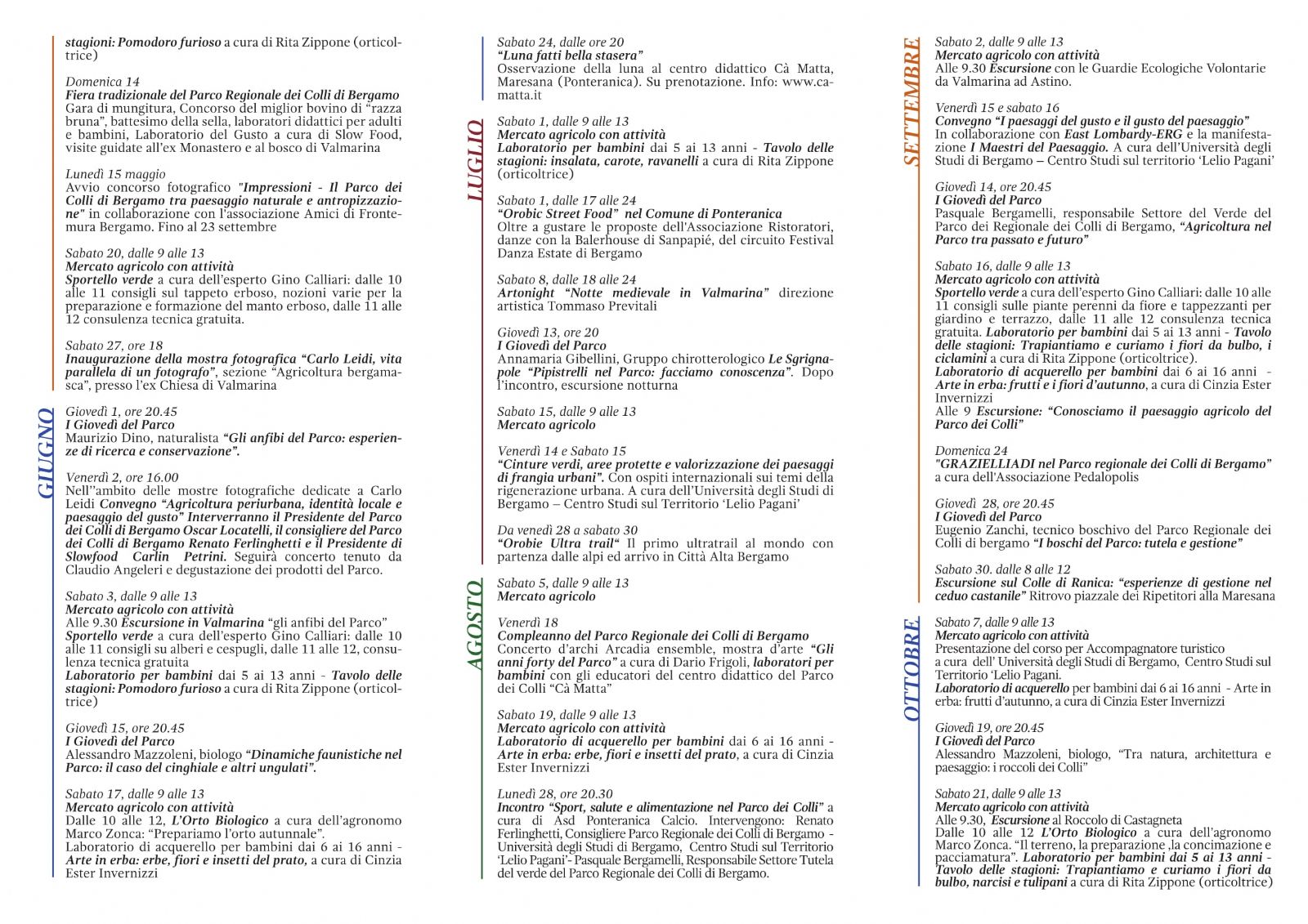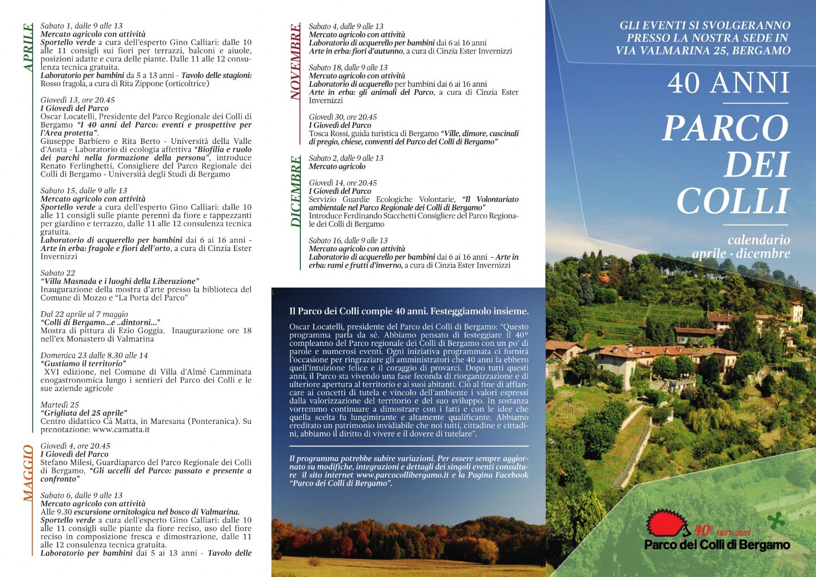 Il compleanno del Parco è il 18 agosto e sarà festeggiato con una mostra d’arte, un concerto e dei laboratori. Ma nel corso di tutto l’anno ci saranno importanti iniziative per sottolineare il ruolo del Parco in questi 40 anni (alcune saranno a cura dei singoli Comuni, ospitate nei rispettivi territori). Tra le prossime inaugurazioni, il 22 aprile, la mostra di pittura di Ezio Goggia “Colli di Bergamo…e ..dintorni…”. E poi la tanto attesa “Festa del Parco”, domenica 14 maggio, che quest’anno si inserisce nella programmazione di East Lombardy, che promuove le eccellenze enogastronomiche del territorio. Protagonisti della fiera gli agricoltori. Come sempre saranno proposti laboratori per grandi e piccini e la possibilità di degustare i prodotti in loco. Ospite speciale in Valmarina, venerdì 2 giugno, il presidente di Slow food Carlo Petrini. Che interverrà al convegno “Agricoltura periurbana, identità locale e paesaggio del gusto”, nell’ambito delle mostre fotografiche dedicate a Carlo Leidi (di cui una sezione è ospitata a Valmarina, dal 27 maggio al 4 giugno).